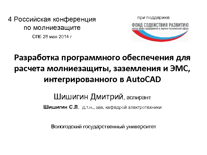 4 Российская конференция по молниезащите при поддержке СПб 28 мая 2014 г Разработка программного обеспечения для расчета молниезащиты, заземления и ЭМС, интегрированного в Auto. CAD Шишигин Дмитрий, аспирант Шишигин С. Л. д. т. н. , зав. кафедрой электротехники Вологодский государственный университет
