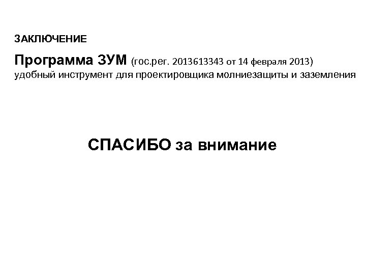 ЗАКЛЮЧЕНИЕ Программа ЗУМ (гос. рег. 2013613343 от 14 февраля 2013) удобный инструмент для проектировщика молниезащиты и заземления СПАСИБО за внимание