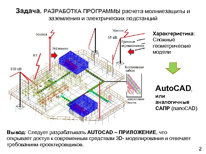 Задача. РАЗРАБОТКА ПРОГРАММЫ расчета молниезащиты и заземления и электрических подстанций Характеристика: Сложные геометрические модели Auto. CAD, или аналогичные САПР (nano. CAD) Вывод: Следует разрабатывать AUTOCAD – ПРИЛОЖЕНИЕ, что открывает доступ к современным средствам 3 D- моделирования и отвечает требованиям проектировщиков. 2