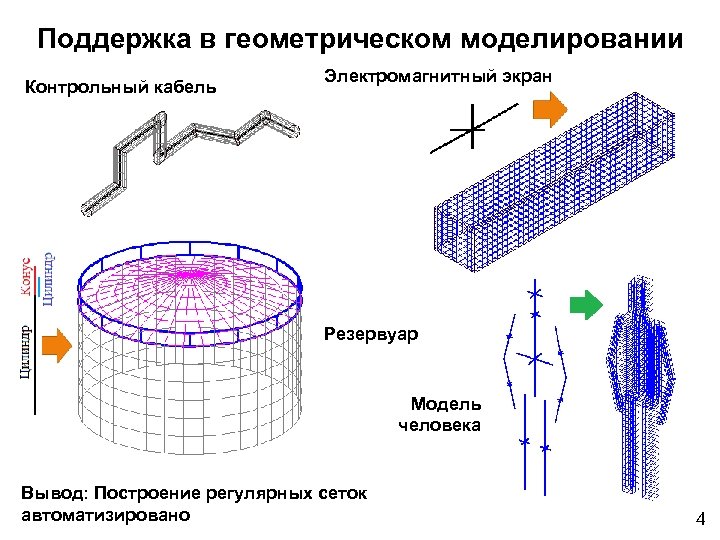 Поддержка в геометрическом моделировании Контрольный кабель Электромагнитный экран Резервуар Модель человека Вывод: Построение регулярных сеток автоматизировано 4