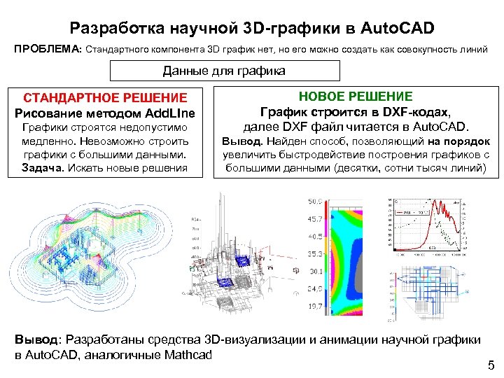 Разработка научной 3 D-графики в Auto. CAD ПРОБЛЕМА: Стандартного компонента 3 D график нет, но его можно создать как совокупность линий Данные для графика СТАНДАРТНОЕ РЕШЕНИЕ Рисование методом Add. LIne Графики строятся недопустимо медленно. Невозможно строить графики с большими данными. Задача. Искать новые решения НОВОЕ РЕШЕНИЕ График строится в DXF-кодах, далее DXF файл читается в Auto. CAD. Вывод. Найден способ, позволяющий на порядок увеличить быстродействие построения графиков с большими данными (десятки, сотни тысяч линий) Вывод: Разработаны средства 3 D-визуализации и анимации научной графики в Auto. CAD, аналогичные Mathcad 5