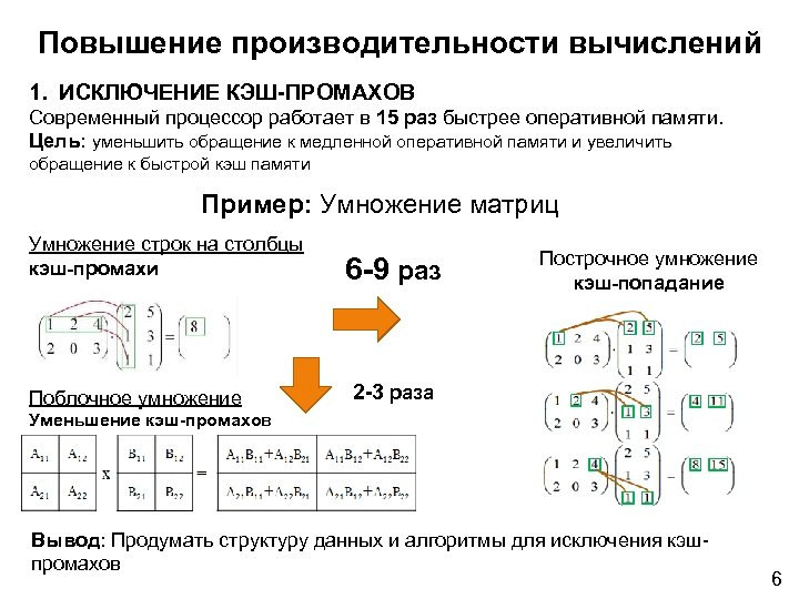 Повышение производительности вычислений 1. ИСКЛЮЧЕНИЕ КЭШ-ПРОМАХОВ Современный процессор работает в 15 раз быстрее оперативной памяти. Цель: уменьшить обращение к медленной оперативной памяти и увеличить обращение к быстрой кэш памяти Пример: Умножение матриц Умножение строк на столбцы кэш-промахи Поблочное умножение 6 -9 раз Построчное умножение кэш-попадание 2 -3 раза Уменьшение кэш-промахов Вывод: Продумать структуру данных и алгоритмы для исключения кэшпромахов 6