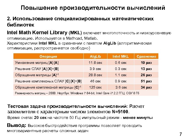 Повышение производительности вычислений 2. Использование специализированных математических библиотек Intel Math Kernel Library (MKL) включает многопоточность и низкоуровневую оптимизацию. Используется в Mathcad, Matlab. Характеристики Intel MKL в сравнении с пакетом Alg. Lib (алгоритмическая оптимизация, распространяется свободно) Операция Alg. Lib Intel MKL Сравнение Умножение матриц [A] 11. 8 сек 0. 6 сек 19 раз Решение СЛАУ [A]. [X]=[B] 3. 9 сек 0. 3 сек 13 раз Обращение матрицы [A]-1 28. 8 сек 1. 1 сек 26 раз Решение комплексных СЛАУ [C]. [X]=[B] 46 сек 0. 9 сек 51 раз Обращение комплексной матрицы [C]-1 125 сек 3. 6 сек 34 раз Размерность матриц – 2000. Ноутбук: Windows 7 64 -bit, Intel Core i 7 2. 2 ГГЦ, ОЗУ 6 Гб Тестовая задача производительности вычислений: Расчет заземлителя с характерным числом элементов N=5100. Время счета: 20 сек на частоте 50 Гц; импульсный режим - менее минуты Вывод: Высокое быстродействие программы позволяет проводить многовариантные расчеты сложных задач 7