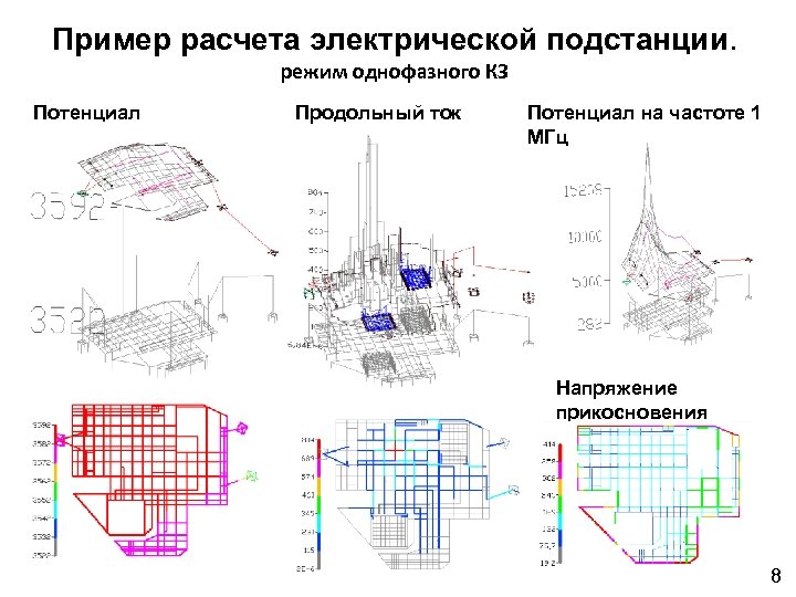 Пример расчета электрической подстанции. режим однофазного КЗ Потенциал Продольный ток Потенциал на частоте 1 МГц Напряжение прикосновения 8