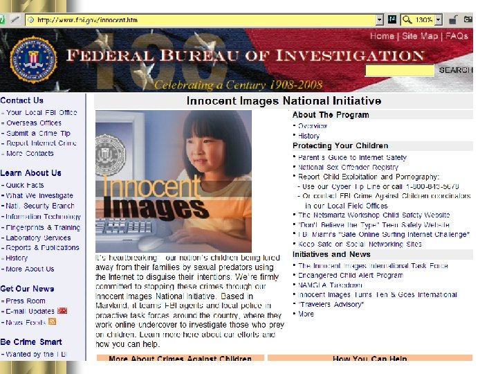Cyber Predators Statistics l “…A child goes missing every 40 seconds in the U. S, over 2, 100 per day” (OJJDP) l In 2005, 662, 196 children were reported lost, runaway, or kidnapped (ncmec) l 2/3 of all missing children reports were for youths aged 15 -17 (ncmec) l 2/5 missing children ages 15 -17 are abducted due to Internet activity (ICAC)
