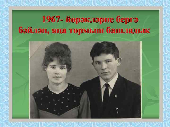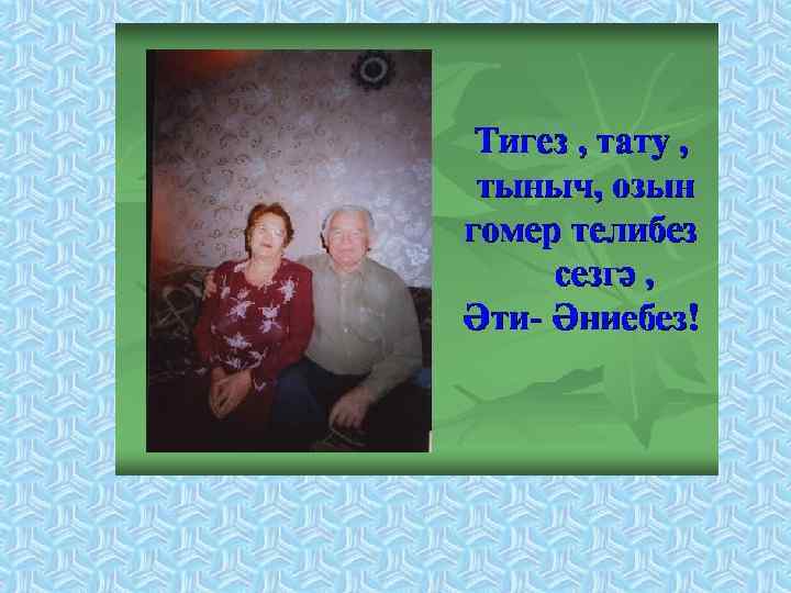 Кырык биш ел иңне-иңгә куеп, Бергә тартып тормыш арбасын, Бер-берегезне сөеп, безгә үрнәк булып Һәрчак туры юлдан барасыз.