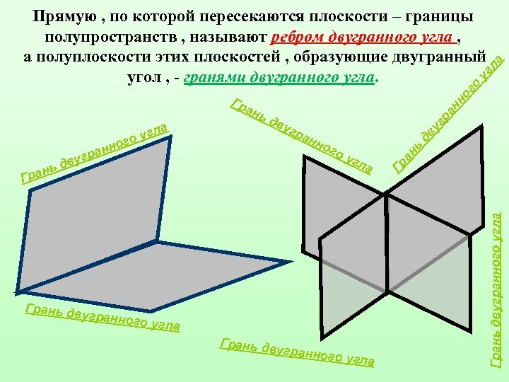 Грань дв ан но го дв у гр угл а угранног о угла Грань дв угранног о угла ь г дву ву Грань двугранного угла нь Гра н ран ого а угл ьд ан ан Гр Гр гр ан но го уг ла Прямую , по которой пересекаются плоскости – границы полупространств , называют ребром двугранного угла , а полуплоскости этих плоскостей , образующие двугранный угол , - гранями двугранного угла.