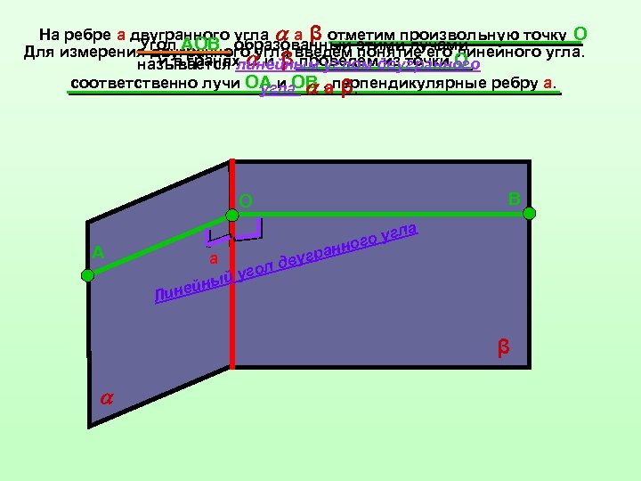 На ребре а двугранного угла а β отметим произвольную точку O Угол АОВ , образованный понятие его линейного угла. Для измерения двугранного угла введём этими лучами , и в гранях и β проведём из точки O называется линейным углом двугранного соответственно лучи ОА и ОВ , аперпендикулярные ребру а. угла β. В О ла о уг г анно А Лин р а двуг ол й уг ейны β