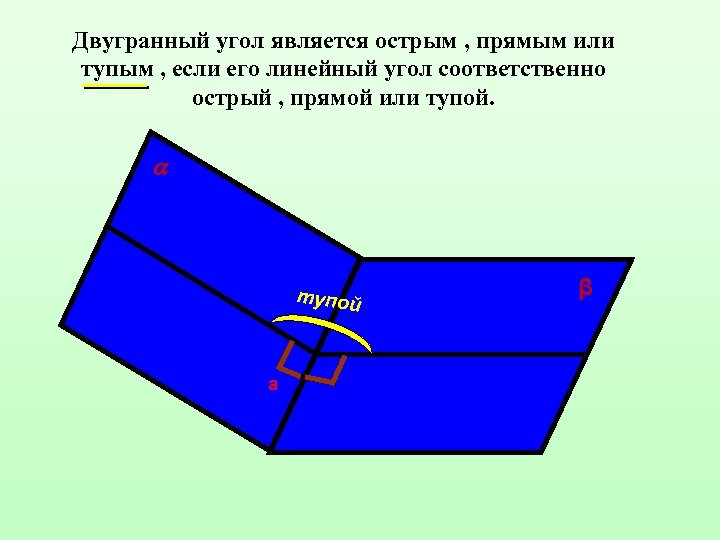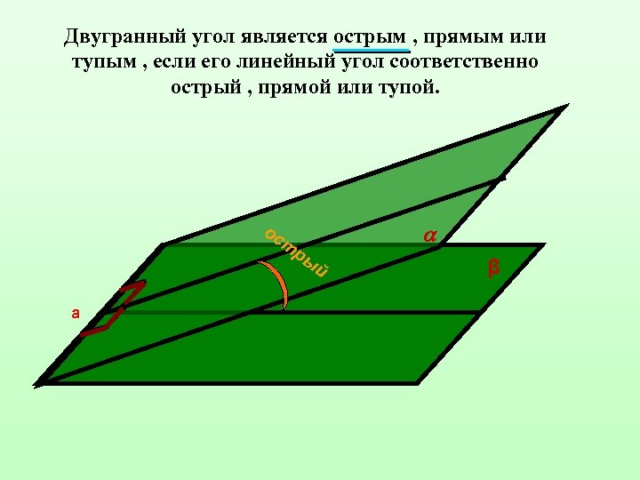 Двугранный угол является острым , прямым или тупым , если его линейный угол соответственно острый , прямой или тупой а β
