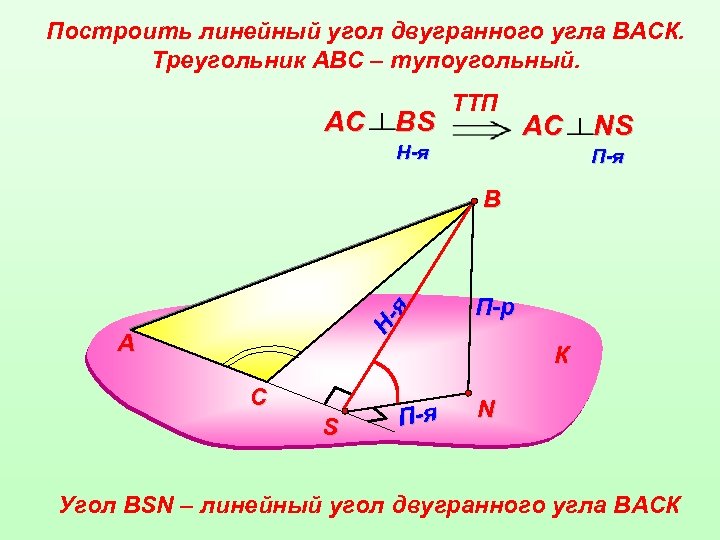 Построить линейный угол двугранного угла ВАСК. Треугольник АВС – тупоугольный. АС ВS TTП H-я АС NS П-я Ня В А П-р К С S П-я N Угол ВSN – линейный угол двугранного угла ВАСК