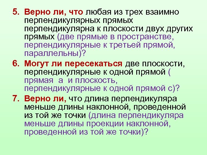 5. Верно ли, что любая из трех взаимно перпендикулярных прямых перпендикулярна к плоскости двух других прямых (две прямые в пространстве, перпендикулярные к третьей прямой, параллельны)? 6. Могут ли пересекаться две плоскости, перпендикулярные к одной прямой ( прямая а и плоскость, перпендикулярные к одной прямой с)? 7. Верно ли, что длина перпендикуляра меньше длины наклонной, проведенной из той же точки (длина перпендикуляра меньше длины проекции наклонной, проведенной из той же точки)?