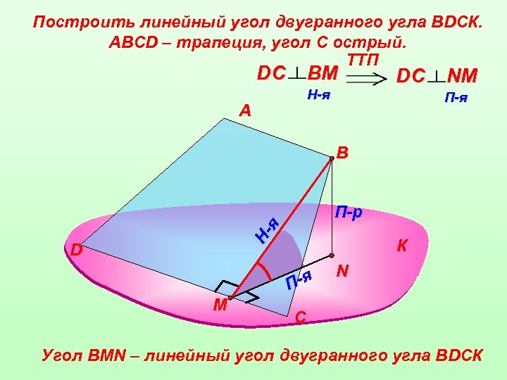 Построить линейный угол двугранного угла ВDСК. АВСD – трапеция, угол С острый. TTП DС ВM H-я А DС NM П-я В Ня П-р D К П-я M N С Угол ВMN – линейный угол двугранного угла ВDСК