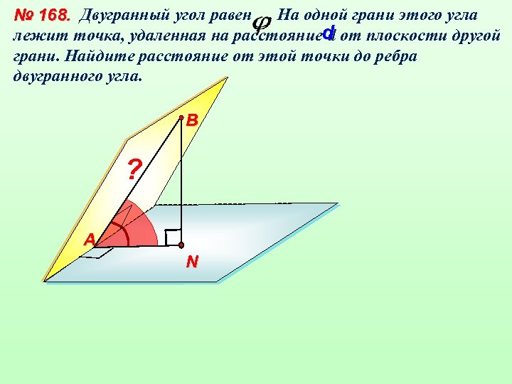 № 168. Двугранный угол равен. На одной грани этого угла лежит точка, удаленная на расстояниеd от плоскости другой d грани. Найдите расстояние от этой точки до ребра двугранного угла. В ? А N