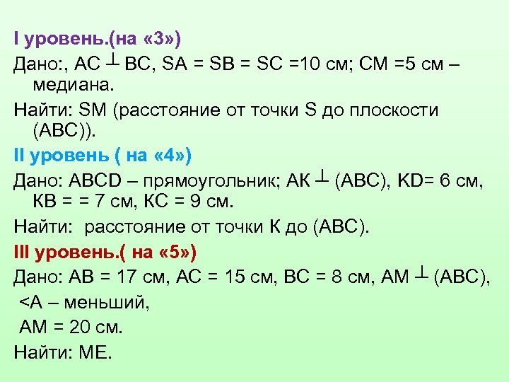 I уровень. (на « 3» ) Дано: , АС ┴ ВС, SA = SB = SC =10 см; СМ =5 см – медиана. Найти: SM (расстояние от точки S до плоскости (АВС)). II уровень ( на « 4» ) Дано: ABCD – прямоугольник; АК ┴ (АВС), KD= 6 см, КВ = = 7 см, КС = 9 см. Найти: расстояние от точки К до (АВС). III уровень. ( на « 5» ) Дано: АВ = 17 см, АС = 15 см, ВС = 8 см, АМ ┴ (АВС), <А – меньший, АМ = 20 см. Найти: МЕ.