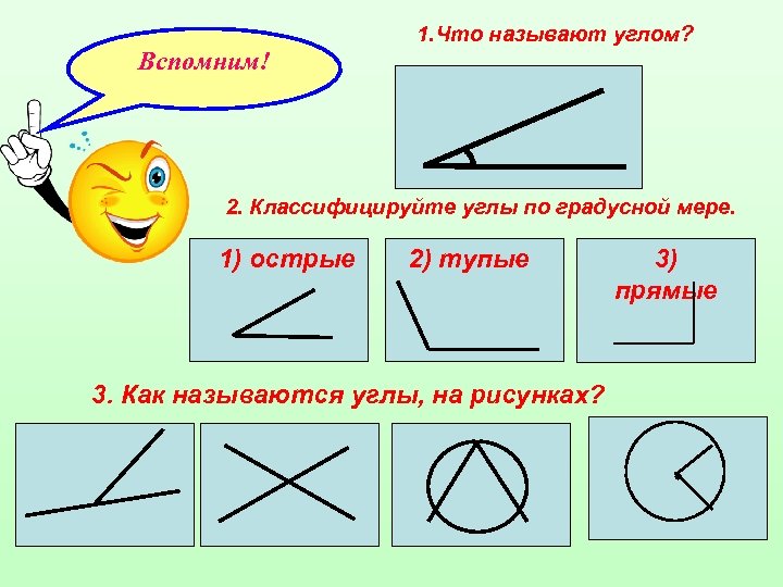 1. Что называют углом? Вспомним! 2. Классифицируйте углы по градусной мере. 1) острые 2) тупые 3. Как называются углы, на рисунках? 3) прямые