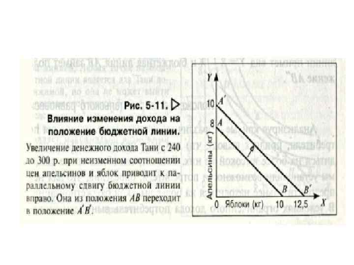 Изменение денежного дохода и положение бюджетной линии: Рассмотрим сначала, как изменяется положение бюджетной линии при изменении дохода потребителя. Если денежный доход Вовы увеличится с 240 до 300 р. , то его реальный доход вырастет до 12, 5 кг яблок или 10 кг апельсинов. Бюджетная линия А В на графике займет положение А'В'. Уравнение новой бюджетной линии А'В' примет вид: У= 10 - 0, 8 X. Y= M / Ру – Рx/Ру*X