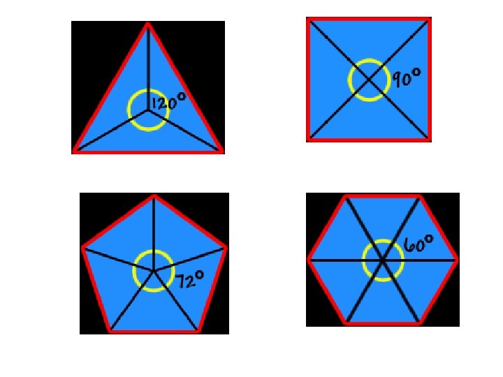 Find the given angle measure for the regular hexagon shown. Each central angle = 60° 60°