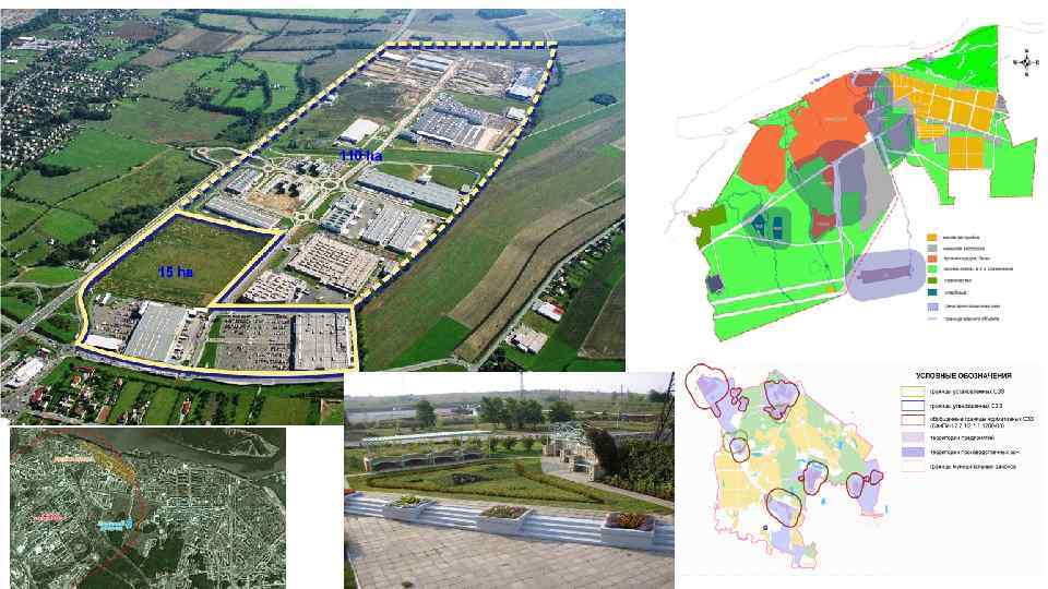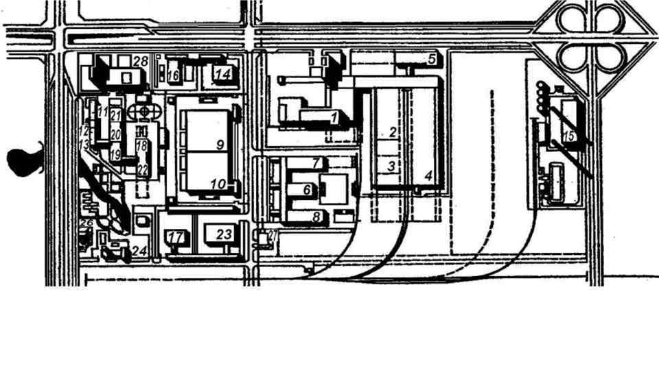 Промислово-комунальна зона в Тобольську (Росія). Експериментальний проект (арх. Н. Кім, М. Розенберг та ін. ). Схема компоновки: комплекс підприємств торгівлі: 1− фабрика напівфабрикатів і кулінарних виробів; 2 – склад продовольчих товарів; 3 – холодильник; 4 – плодово-овочева база; 5 – промтоварна база; комплекс підприємств харчової промисловості: 6 – хлібозавод; 7 – пивзавод; 8 – міський молокозавод; комплекс автотранспортних підприємств: 9 – гараж автобусів; 10 – гараж вантажних автомобілів; 11 – гараж легкових автомобілів; 12 – СТО автомобілів; комплекс підприємств комунального призначення: 13 – виробничо-експлуатаційна база дорожніх і прибиральних машин; 14 – комплексна база служб експлуатації інженерних мереж і споруд; комплекс підприємств побутового обслуговування: 15 – фабрика-пральня; 16 – пральняхімчистка спецодягу; 17 – фабрика хімчистки і фарбування одягу; 18 – спеціалізоване підприємство з ремонту та пошиття взуття; 19 – спеціалізоване підприємство з ремонту побутових машин і приладів; 20 – підприємство з ремонту і виготовлення меблів; 21− виробнича база з ремонту і будівництва житла індивідуальним замовникам; об’єкти загального призначення: 22 – АЗС; 23 – пожежне депо; 24 – міська друкарня; 25 – котельня; 26 – каналізаційна насосна; 27 – міська підстанція; 28 – громадсько-торговельний центр