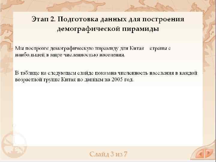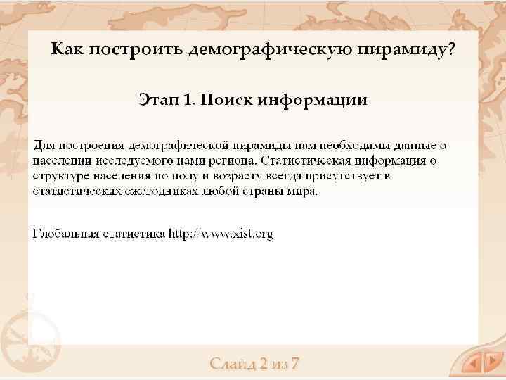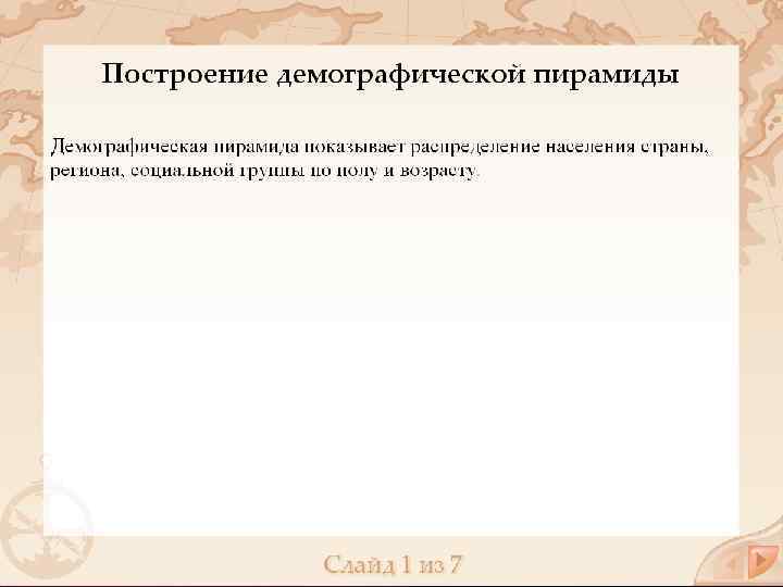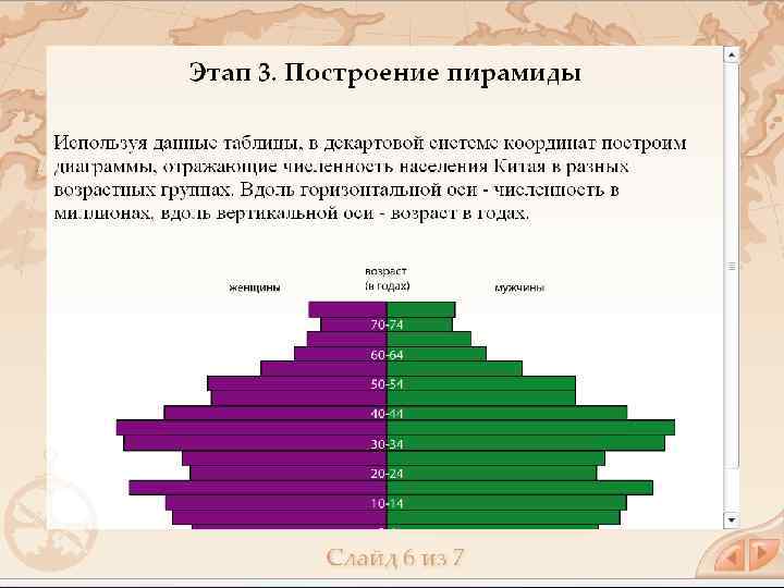 Возрастные демографические пирамиды - графическое изображение распределения населения (отдельных социальных групп, всей страны, региона, мира) по полу и возрасту. Разным типам структуры населения соответствуют разные формы половозрастной пирамиды: 1. молодое (растущее) население - правильная пирамида 2. стареющее население пирамида имеет форму колокола 3. старое (убывающее) население - форму урны Возрастные пирамиды используются для демографических и экономических прогнозов, для изучения воспроизводства населения.