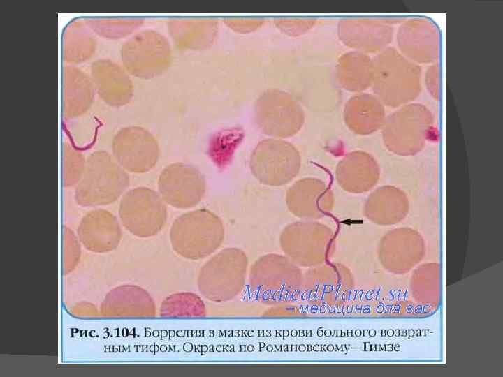 Вшивый возвратный тиф Borrelia recurrentis Obermeieri: в Европе. B. Berbera, B. carteri: в Индии, Азии, США. Антропоноз => эпидемии. Переносчик: вошь Pediculus vestimenti de Geer (становится заразной через 5 дней после кровососания на больном). Укусы вшей => зуд => втирание гемолимфы (при раздавливании вши). Заболеваемость всегда меньше по сравнению с сыпным тифом. Сочетание этих тифов.