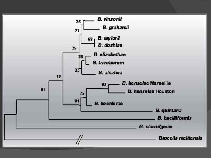 Болезни человека B. bacilliformis (1905 -1927) : болезнь Карриона (1. лихорадка Оройа, 2. перуанская бородавка). B. quintana (1916): траншейная лихорадка, бациллярный ангиоматоз, эндокардит. B. henselae (1990 -94): б-знь кошачьих царапин, бациллярный ангиоматоз, эндокардит. B. elizabethae (1993): эндокардит B. clarridgeiae(1997): б-знь кошачьих царапин, др