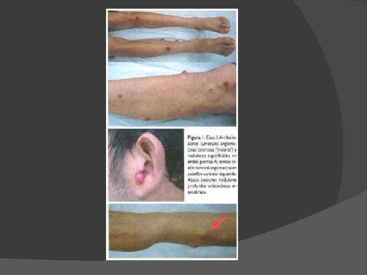 Бациллярный ангиоматоз 1990. Аномальная очаговая пролиферация эндотелия в капиллярах. Обычно при иммунодефиците. - Ангиоматоз кожи – безболезненные папулы (гемангиомы). - Подкожные узды до неск см; лихорадка, поражение органов (легких, печени, КМ, н. с. ) ~ перуанская бородавка, крайняя степень.
