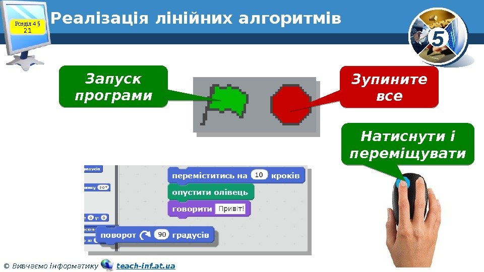 5 © Вивчаємо інформатику teach-inf. at. ua. Реалізація лінійних алгоритмів Розділ 4 § 21 Запуск програми Зупините все Натиснути і переміщувати