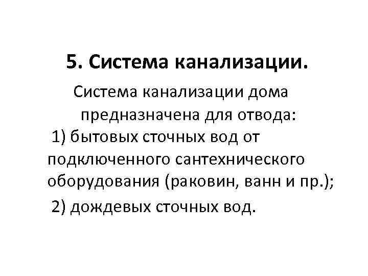 5. Система канализации дома предназначена для отвода: 1) бытовых сточных вод от подключенного сантехнического оборудования (раковин, ванн и пр. ); 2) дождевых сточных вод.