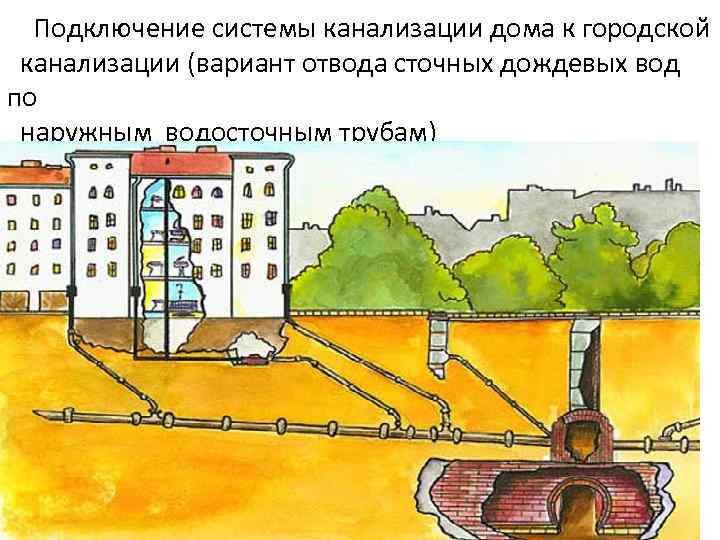 Подключение системы канализации дома к городской канализации (вариант отвода сточных дождевых вод по наружным водосточным трубам)