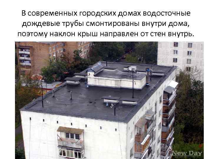 В современных городских домах водосточные дождевые трубы смонтированы внутри дома, поэтому наклон крыш направлен от стен внутрь.