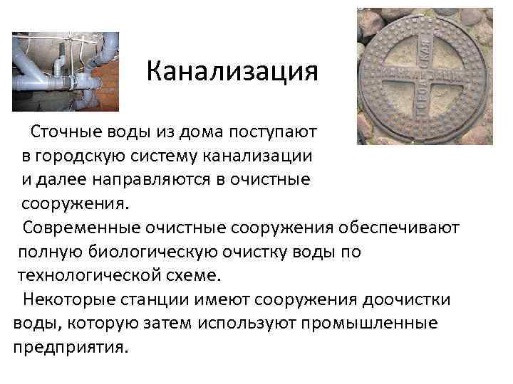 Канализация Сточные воды из дома поступают в городскую систему канализации и далее направляются в очистные сооружения. Современные очистные сооружения обеспечивают полную биологическую очистку воды по технологической схеме. Некоторые станции имеют сооружения доочистки воды, которую затем используют промышленные предприятия.