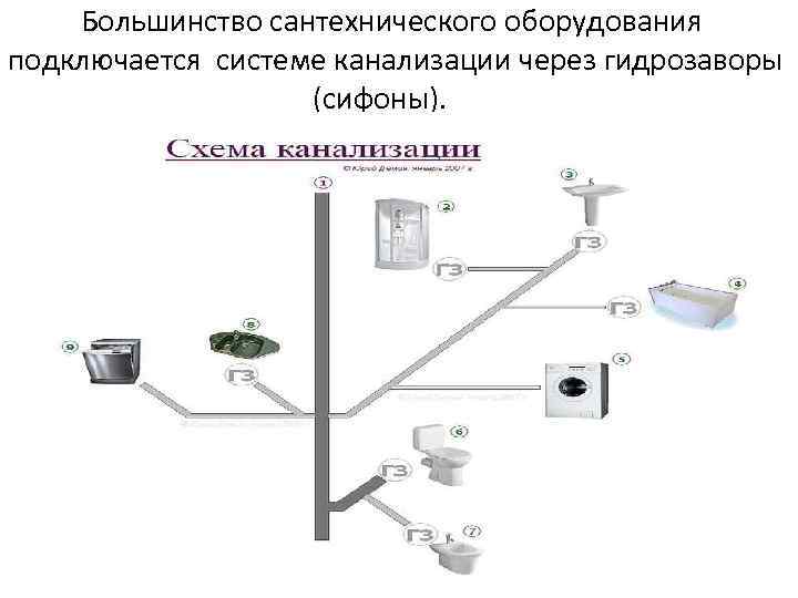 Большинство сантехнического оборудования подключается системе канализации через гидрозаворы (сифоны).