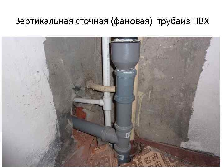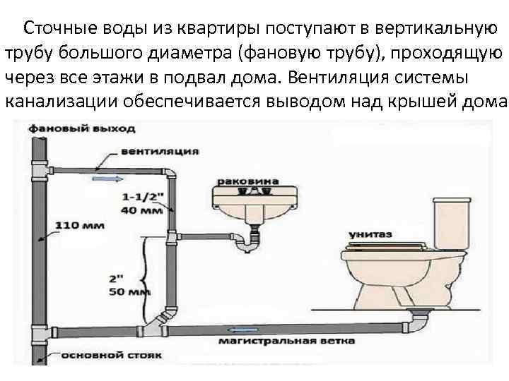 Сточные воды из квартиры поступают в вертикальную трубу большого диаметра (фановую трубу), проходящую через все этажи в подвал дома. Вентиляция системы канализации обеспечивается выводом над крышей дома