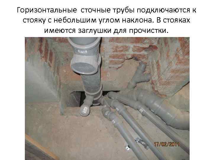 Горизонтальные сточные трубы подключаются к стояку с небольшим углом наклона. В стояках имеются заглушки для прочистки.