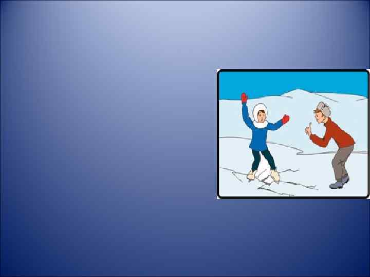 5. Во всех случаях, прежде чем сойти с берега на лёд, необходимо внимательно осмотреться, наметить маршрут движения , выбирая безопасные места. Лучше всего идти по проложенной тропе. Опасно выходить на лёд при оттепели. Не следует спускаться на лёд в незнакомых местах, особенно с обрывов. .