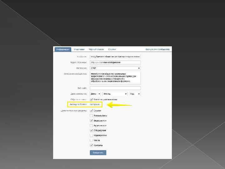 4. Выберите оптимальные настройки Поставьте галочку напротив разделов, в которых вы будете публиковать контент. Настройте экспорт постов в Twitter. Укажите адрес сайта. Придумайте короткий и запоминающийся URL страницы.
