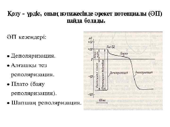 Қозғыштықтың кезеңдері: 1. Абсолюттік рефрактерлік кезең (0, 27 с). 2. Салыстырмалы рефрактерлік кезең (0, 03 с). 3. Супернормалдық кезең.