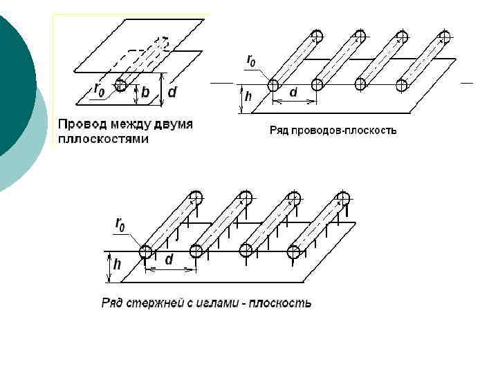 Плоскопараллельные поля Поля, в которых распределение потенциала зависит от расстояния до электродов, и проведении секущей плоскости, нормальной к их образующим поверхностям, эквипотенциальные линии имеют вид прямых, параллельных образующим Примеры: - поля коаксиальных цилиндров - система провод, параллельный плоскости - Провод между плоскостями - Ряд проводов над плоскостью и т. п. ¡