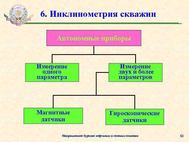 6. Инклинометрия скважин Автономные приборы Измерение одного параметра Измерение двух и более параметров Магнитные датчики Гироскопические датчики Направленное бурение нефтяных и газовых скважин 61