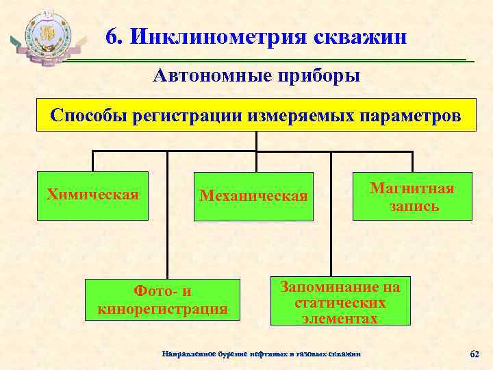 6. Инклинометрия скважин Автономные приборы Способы регистрации измеряемых параметров Химическая Механическая Фото- и кинорегистрация Магнитная запись Запоминание на статических элементах Направленное бурение нефтяных и газовых скважин 62