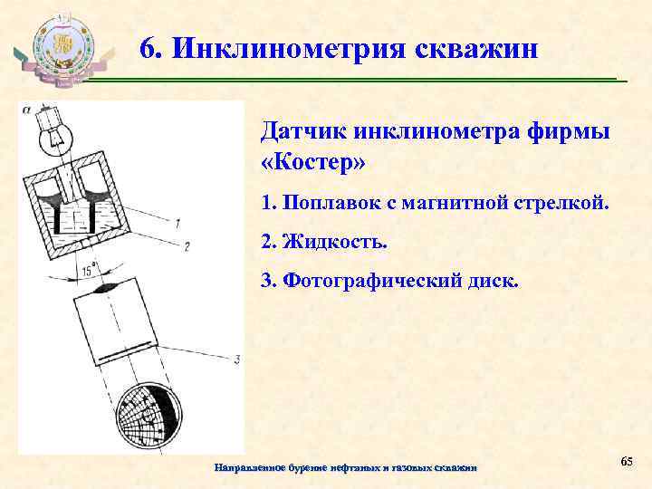6. Инклинометрия скважин Датчик инклинометра фирмы «Костер» 1. Поплавок с магнитной стрелкой. 2. Жидкость. 3. Фотографический диск. Направленное бурение нефтяных и газовых скважин 65