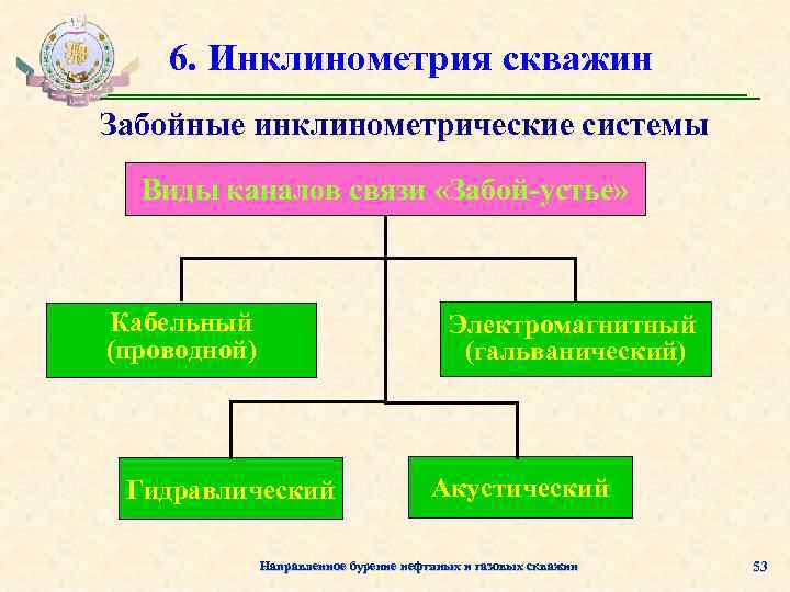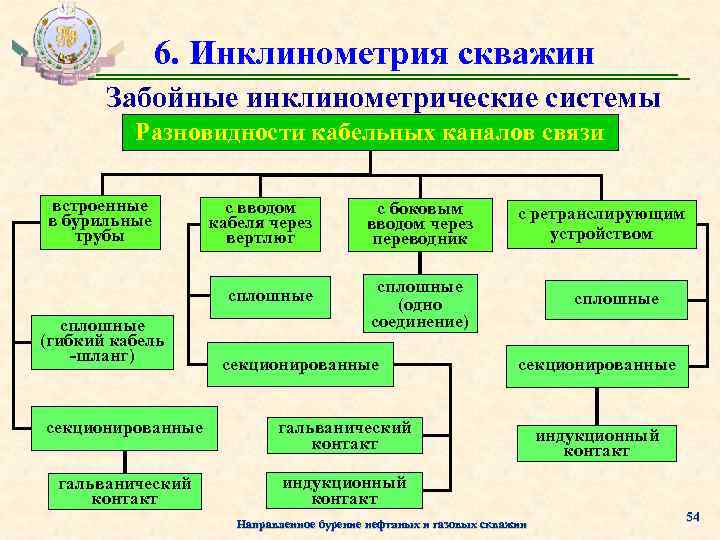 6. Инклинометрия скважин Забойные инклинометрические системы Виды каналов связи «Забой-устье» Кабельный (проводной) Электромагнитный (гальванический) Гидравлический Акустический Направленное бурение нефтяных и газовых скважин 53