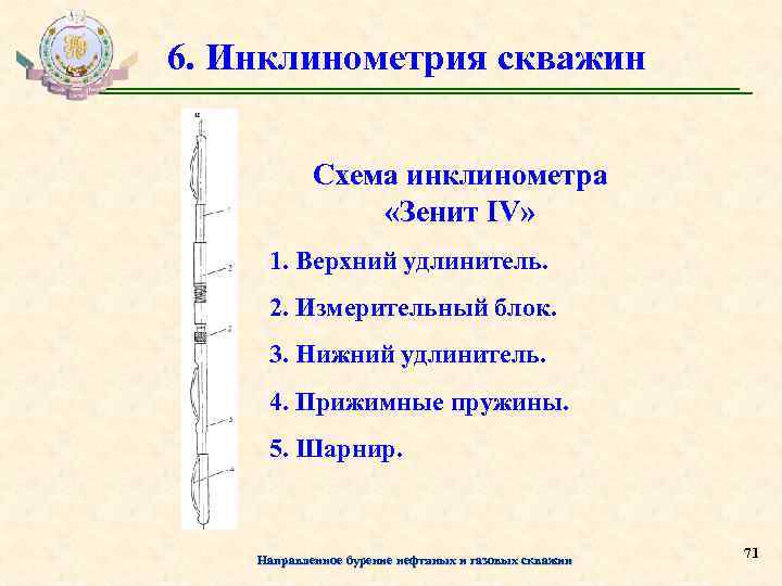 6. Инклинометрия скважин Схема инклинометра «Зенит IV» 1. Верхний удлинитель. 2. Измерительный блок. 3. Нижний удлинитель. 4. Прижимные пружины. 5. Шарнир. Направленное бурение нефтяных и газовых скважин 71