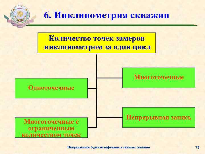 6. Инклинометрия скважин Количество точек замеров инклинометром за один цикл Многоточечные Одноточечные Многоточечные с ограниченным количеством точек Непрерывная запись Направленное бурение нефтяных и газовых скважин 72