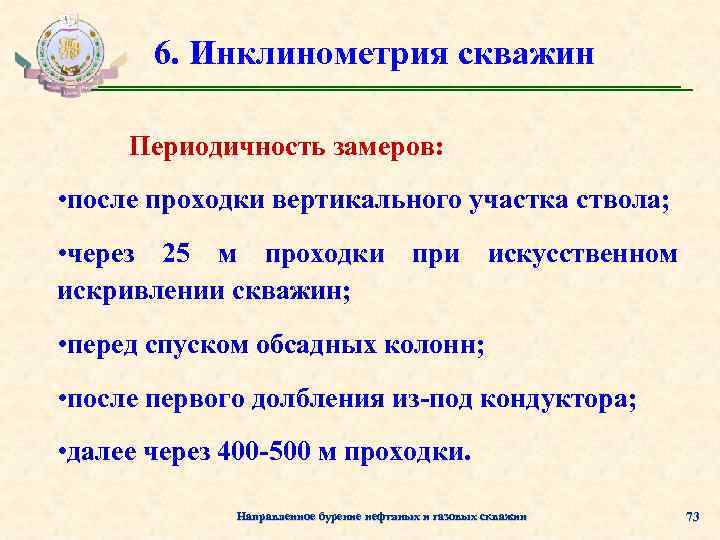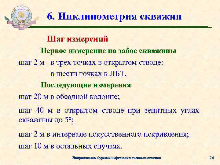 6. Инклинометрия скважин Периодичность замеров: • после проходки вертикального участка ствола; • через 25 м проходки при искусственном искривлении скважин; • перед спуском обсадных колонн; • после первого долбления из-под кондуктора; • далее через 400 -500 м проходки. Направленное бурение нефтяных и газовых скважин 73