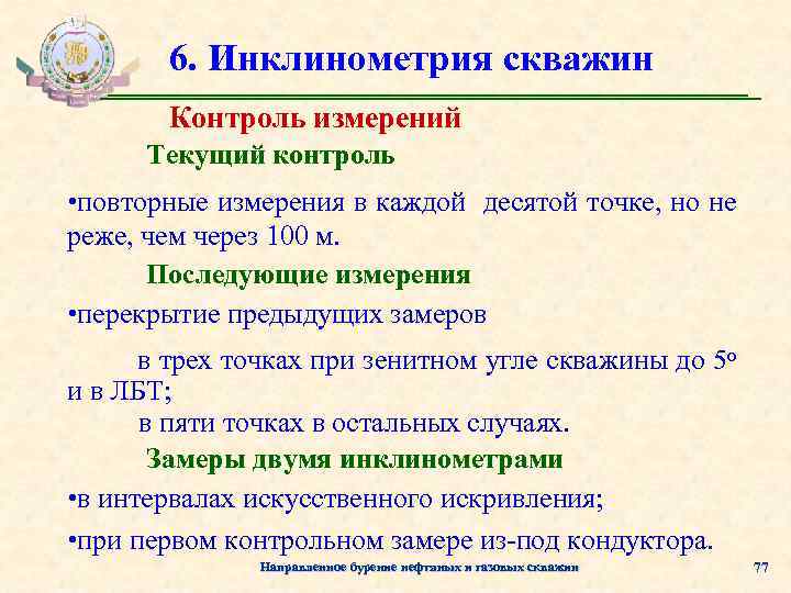 6. Инклинометрия скважин Шаг измерений Первое измерение на забое скважины шаг 2 м в трех точках в открытом стволе: в шести точках в ЛБТ. Последующие измерения шаг 20 м в обсадной колонне; шаг 40 м в открытом стволе при зенитных углах скважины до 5 о; шаг 2 м в интервале искусственного искривления; шаг 10 м в остальных случаях. Направленное бурение нефтяных и газовых скважин 74