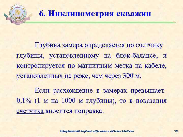 6. Инклинометрия скважин Глубина замера определяется по счетчику глубины, установленному на блок-балансе, и контролируется по магнитным метка на кабеле, установленных не реже, чем через 300 м. Если расхождение в замерах превышает 0, 1% (1 м на 1000 м глубины), то в показания счетчика вносится поправка. Направленное бурение нефтяных и газовых скважин 79