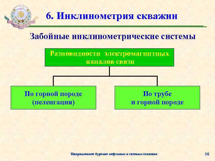 6. Инклинометрия скважин Забойные инклинометрические системы Разновидности электромагнитных каналов связи По горной породе (пеленгация) По трубе и горной породе Направленное бурение нефтяных и газовых скважин 56