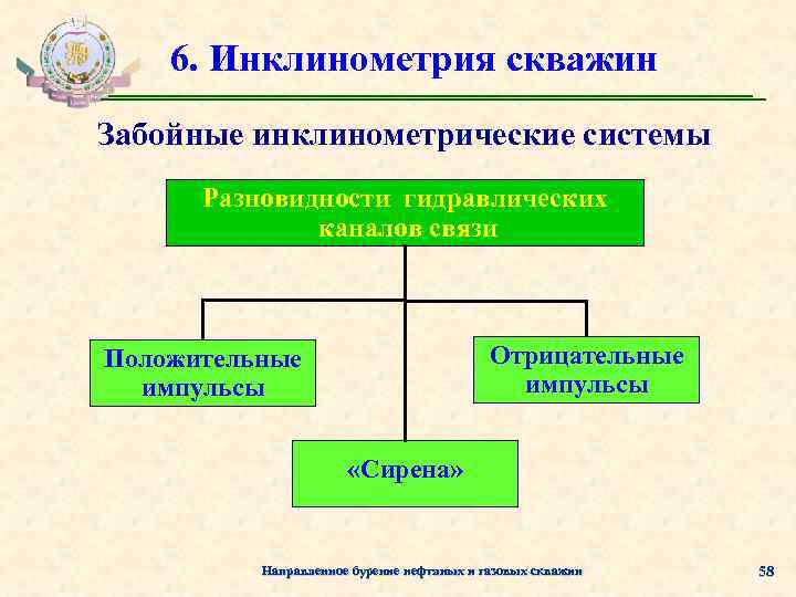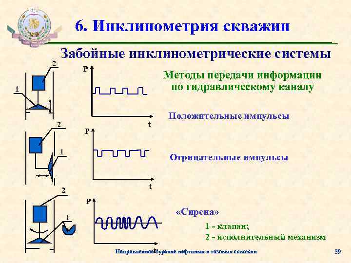 6. Инклинометрия скважин Забойные инклинометрические системы Разновидности гидравлических каналов связи Отрицательные импульсы Положительные импульсы «Сирена» Направленное бурение нефтяных и газовых скважин 58