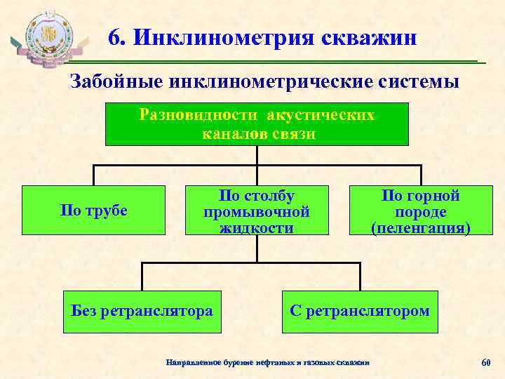 6. Инклинометрия скважин Забойные инклинометрические системы Разновидности акустических каналов связи По трубе По столбу промывочной жидкости Без ретранслятора По горной породе (пеленгация) С ретранслятором Направленное бурение нефтяных и газовых скважин 60